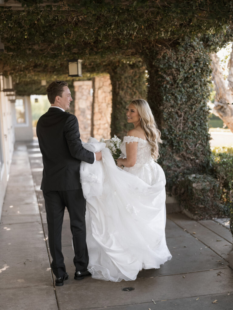 Before the reception began, Emily and Eric slipped away for some golden hour photos. These veil shots were especially dreamy—romantic, glowy and full of movement. The timing was perfect, with guests being seated and the sun just beginning to dip behind the hills.