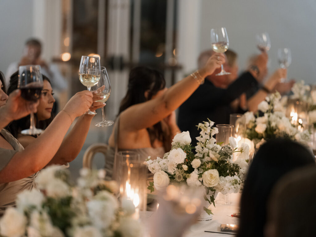 As guests settled in, the reception kicked off with a bang. A white dance floor and custom gobo light monogram set the scene and a white DJ facade helped elevate the whole aesthetic. Their first dance featured cold sparklers—it was magical and such a fun surprise for their guests. After some heartfelt toasts, the dance floor opened and the celebration continued with an ice cream cart, wedding cake and a champagne tower to top it all off. It was the perfect end to a perfect day.