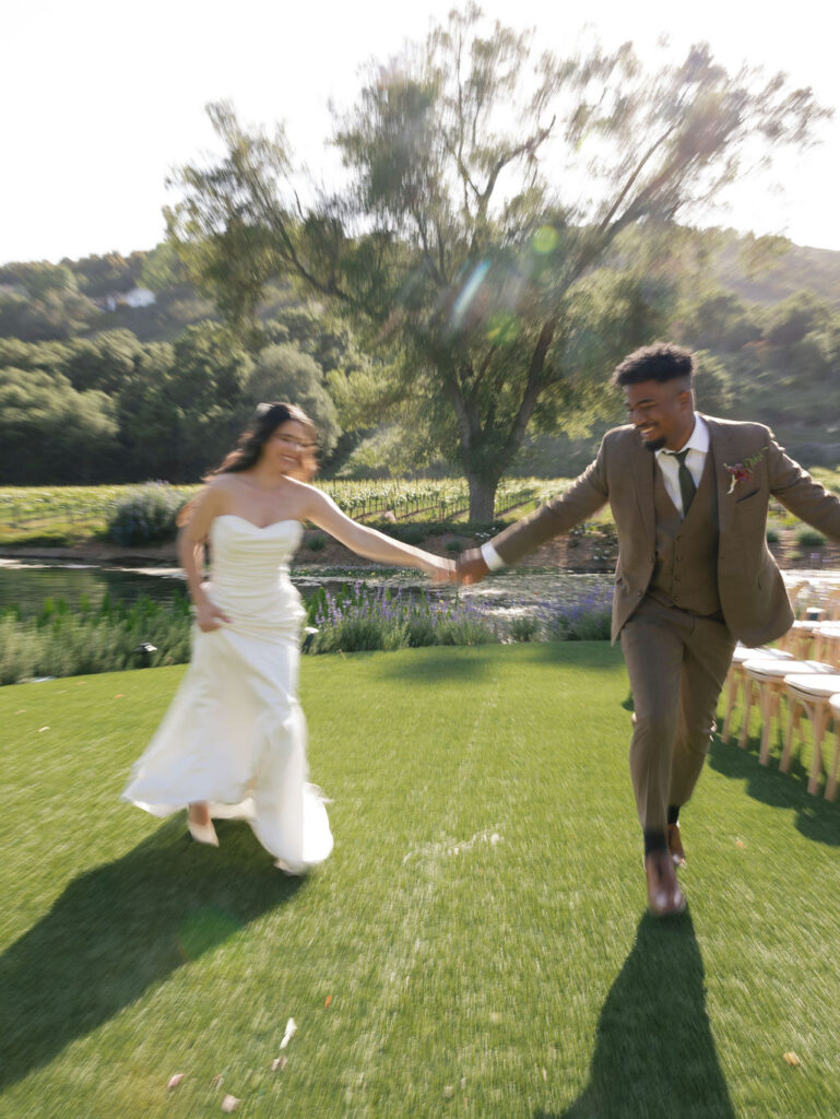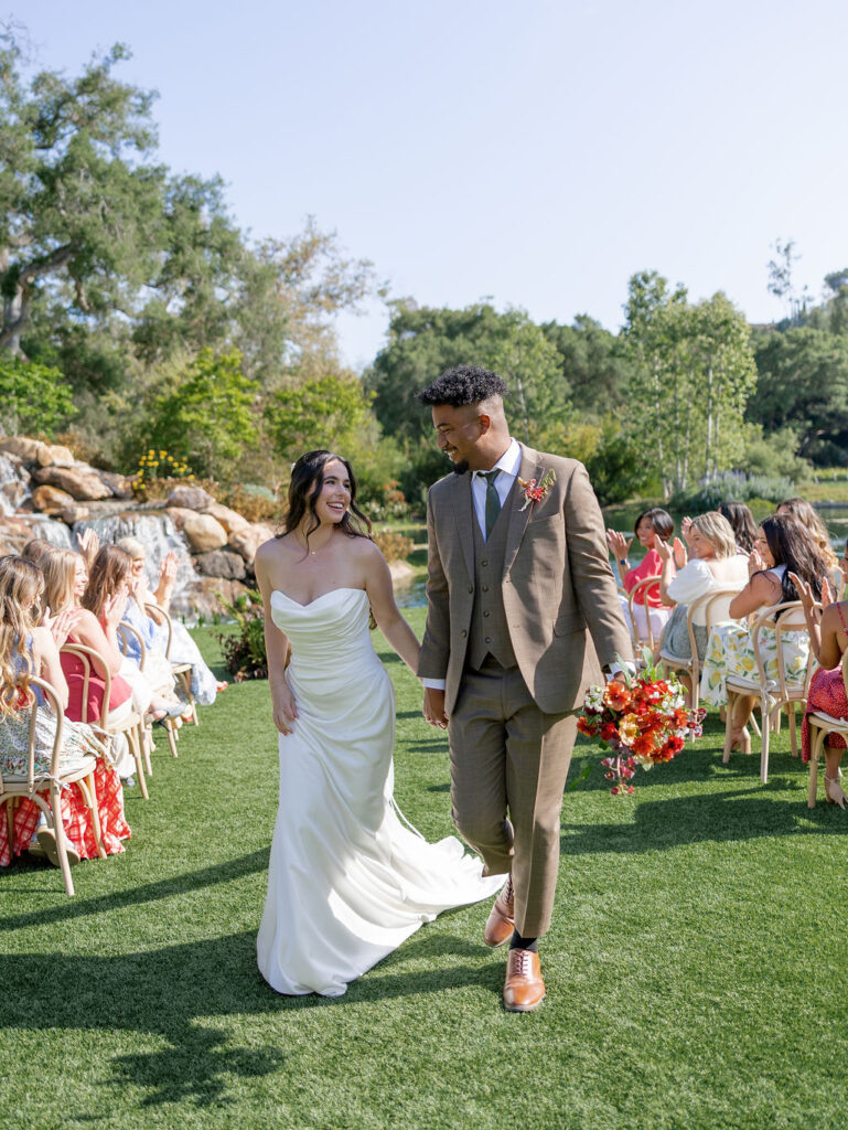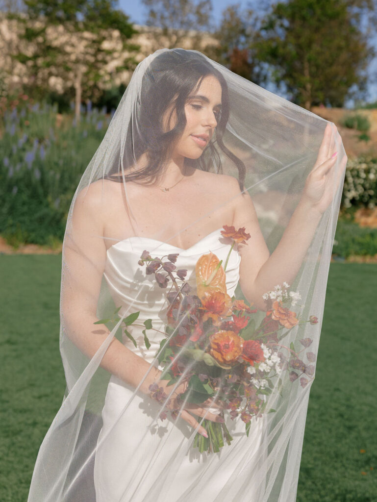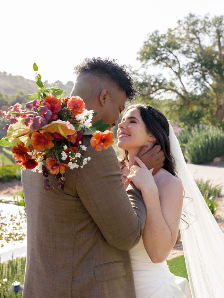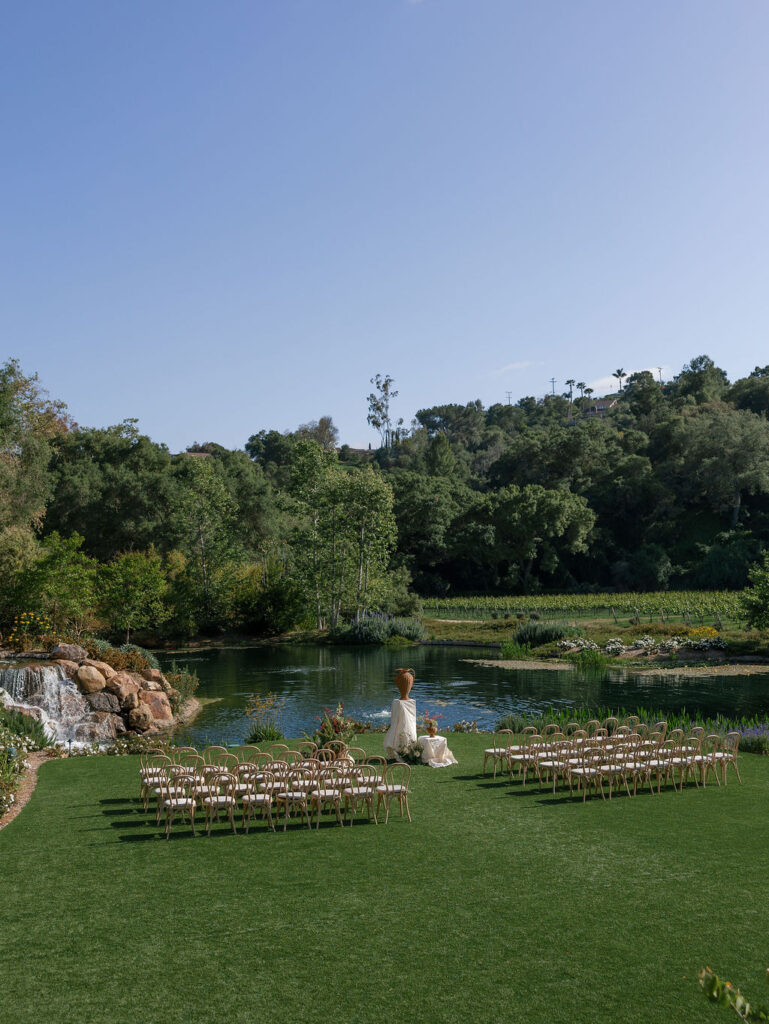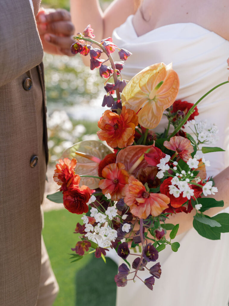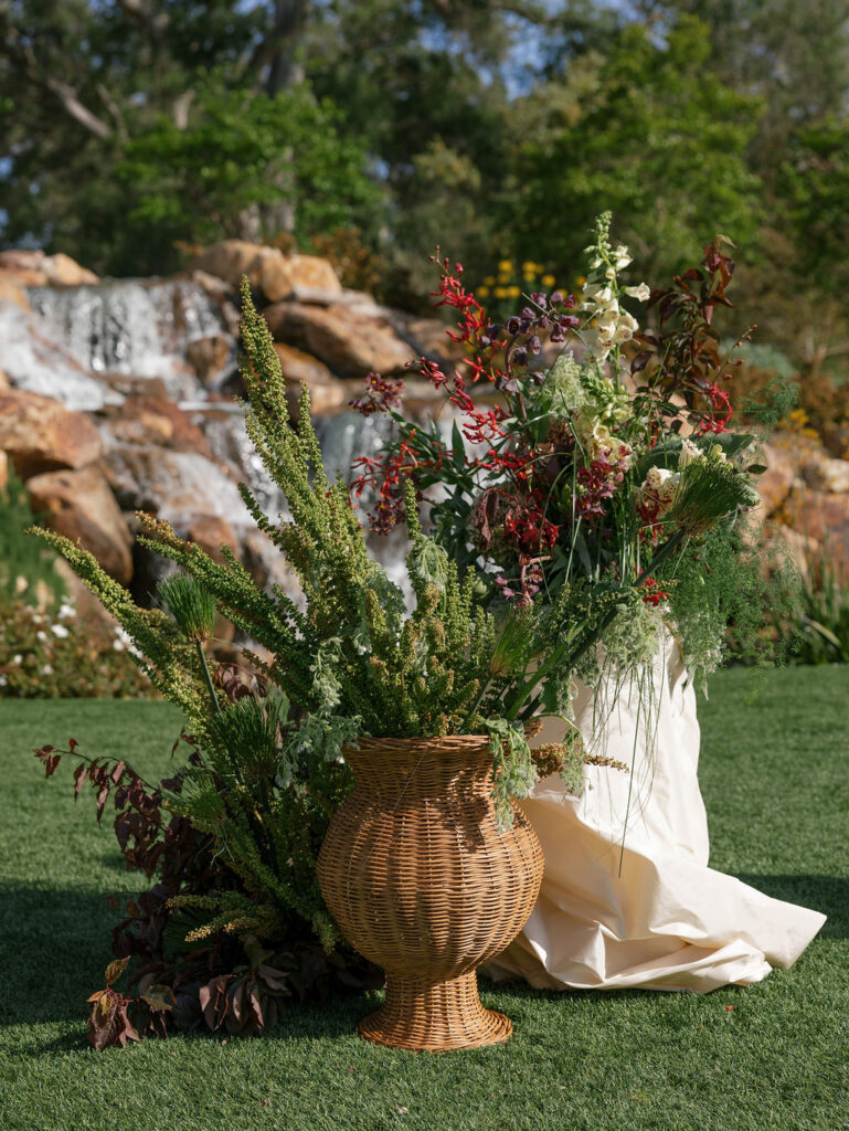 Set against Monserate’s serene landscape, the ceremony design complemented the surrounding greenery rather than competing with it. Sculptural urns, untamed florals, and soft neutrals allowed the natural backdrop to shine, creating a ceremony space that felt intimate, organic, and effortlessly elevated. The bride’s sculptural bouquet full of movement and rich color, was a standout moment against her clean, modern gown.