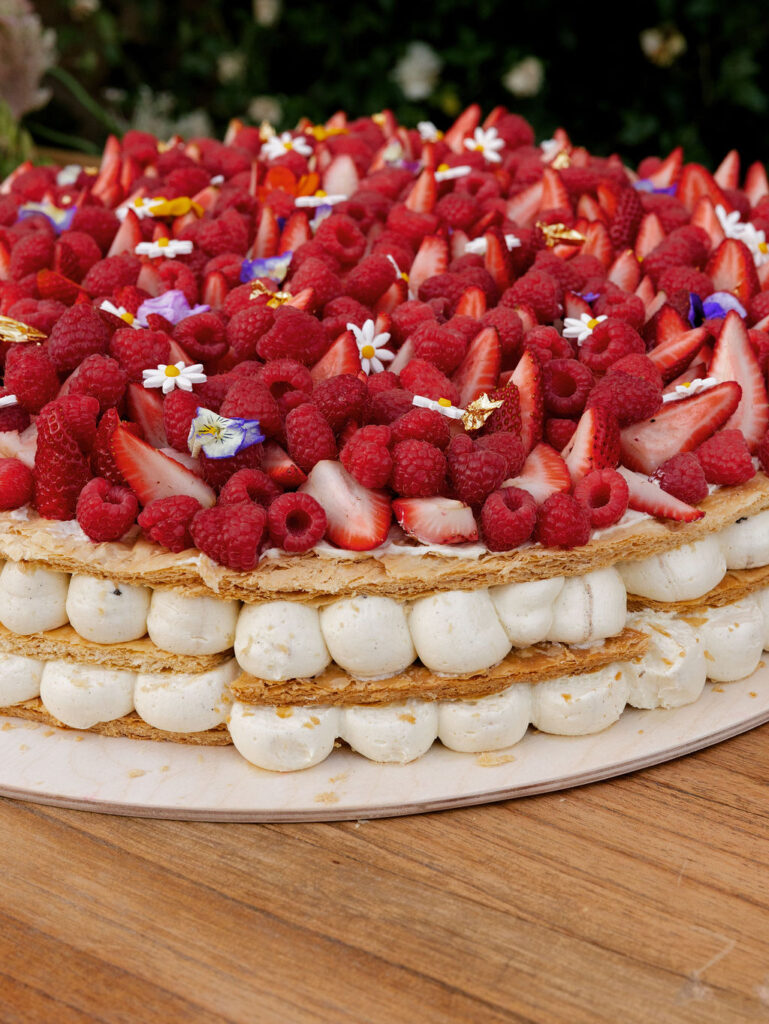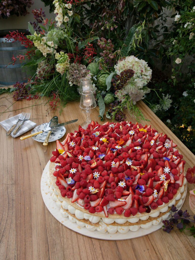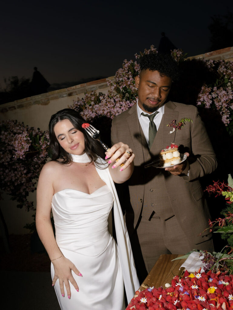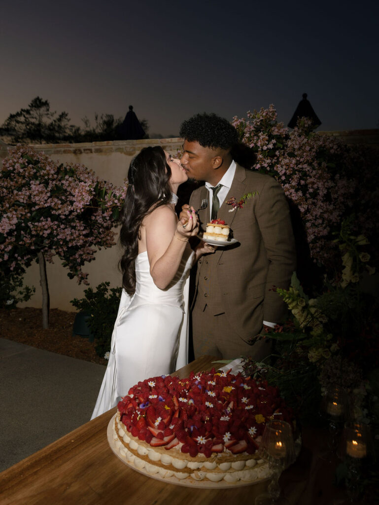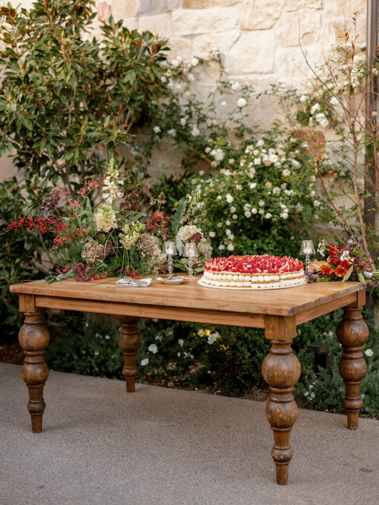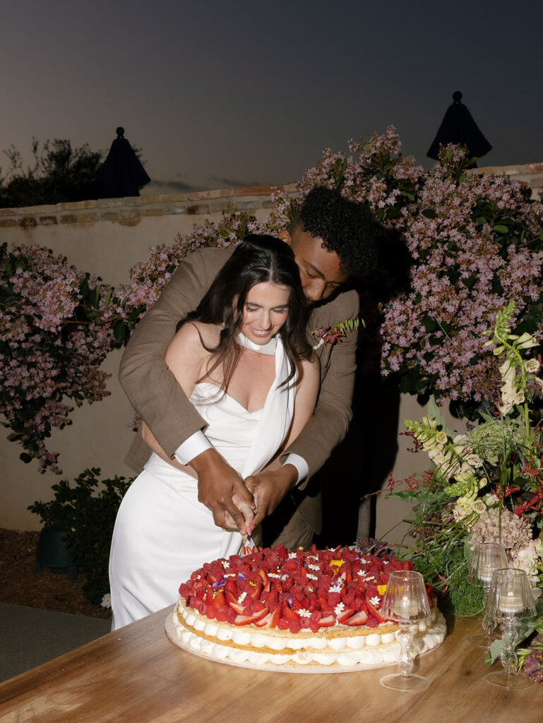 To honor the playful spirit of “That’s Amore,” we opted for a giant pavlova-style cake bursting with berries, edible florals, and textured meringue layers. It felt celebratory and joyful, still elevated, still refined, but a reminder that weddings are meant to be fun. The cake-cutting captured one of our favorite contrasts from the shoot: a sophisticated setting infused with moments of lighthearted charm.