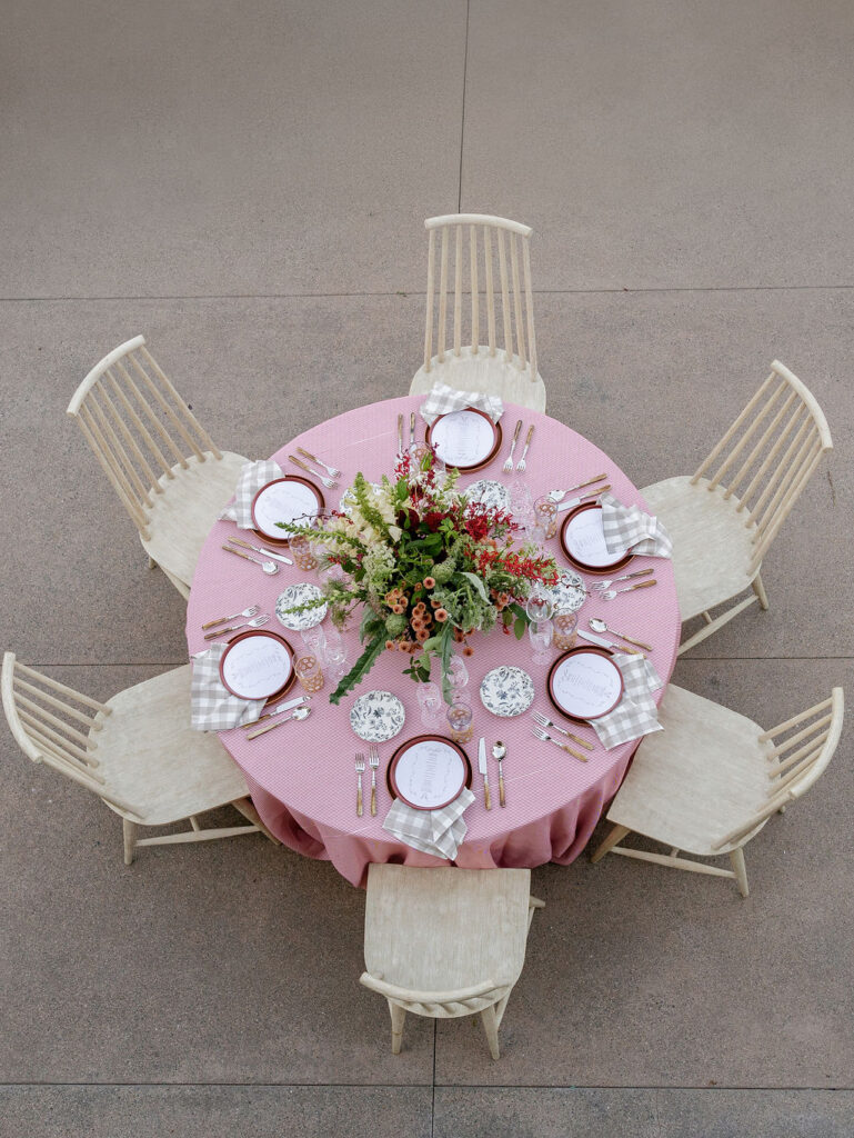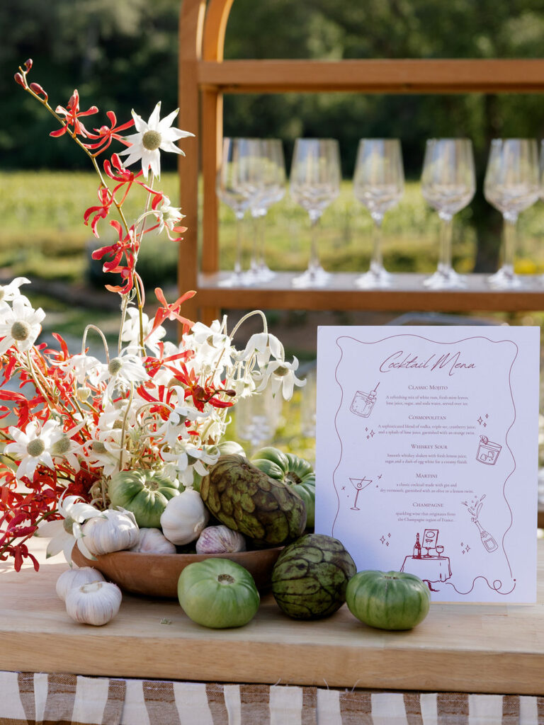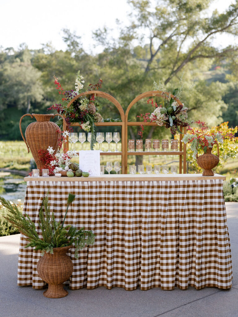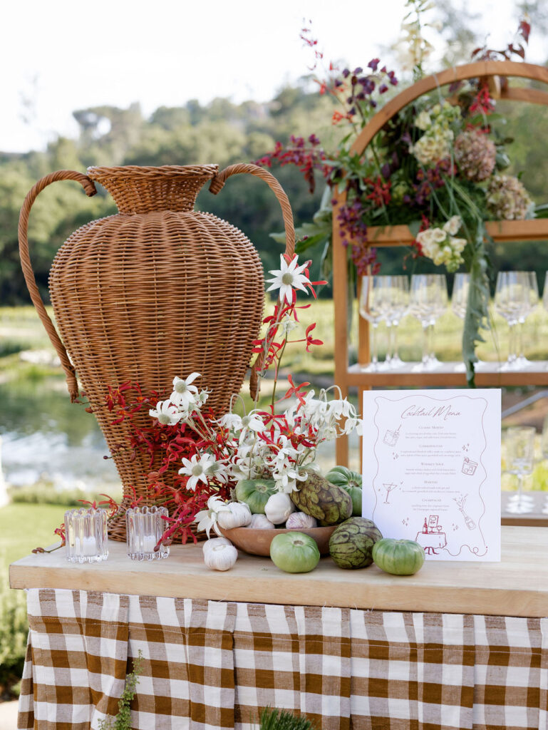 Our bar moment embraced the playful side of the concept with its gingham skirting, overflowing florals, and still-life-style ingredient groupings. Oversized woven urns and wood tones brought a Tuscan farmhouse warmth, pairing naturally with the crisp wine glasses and illustrated signature cocktail menu. It struck the perfect balance between editorial chic and charming whimsy, a signature of this shoot.