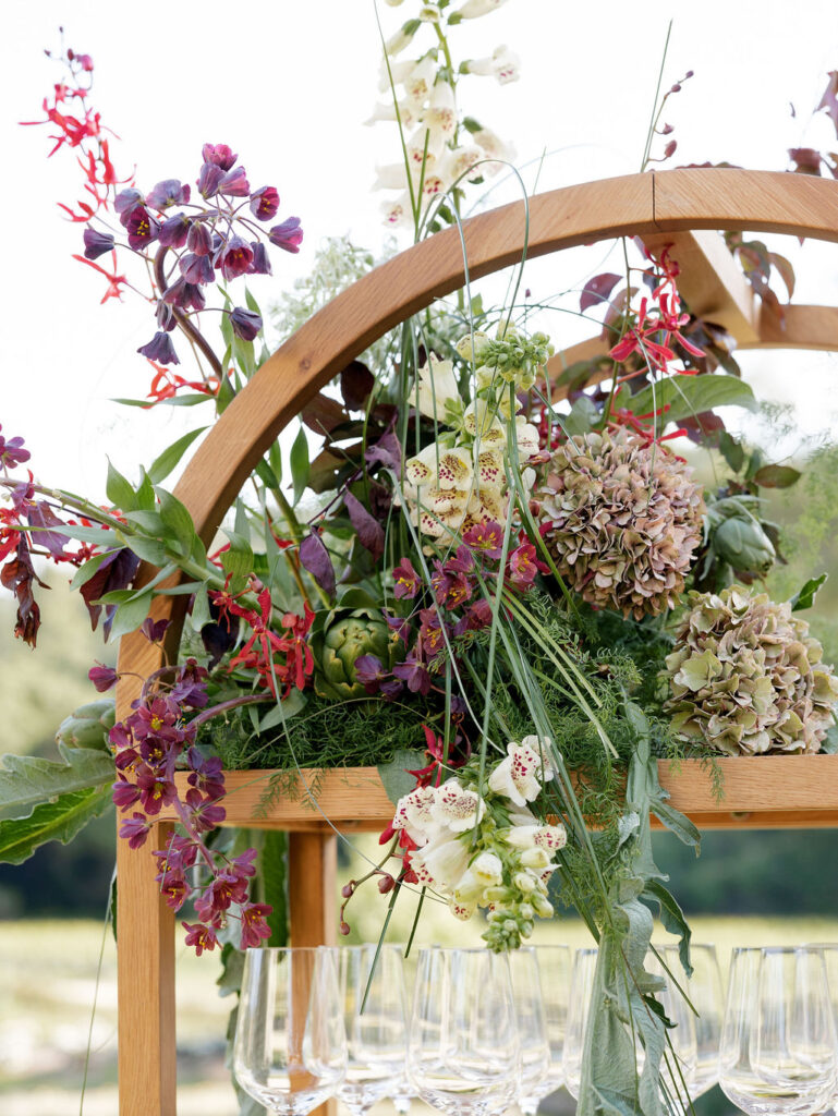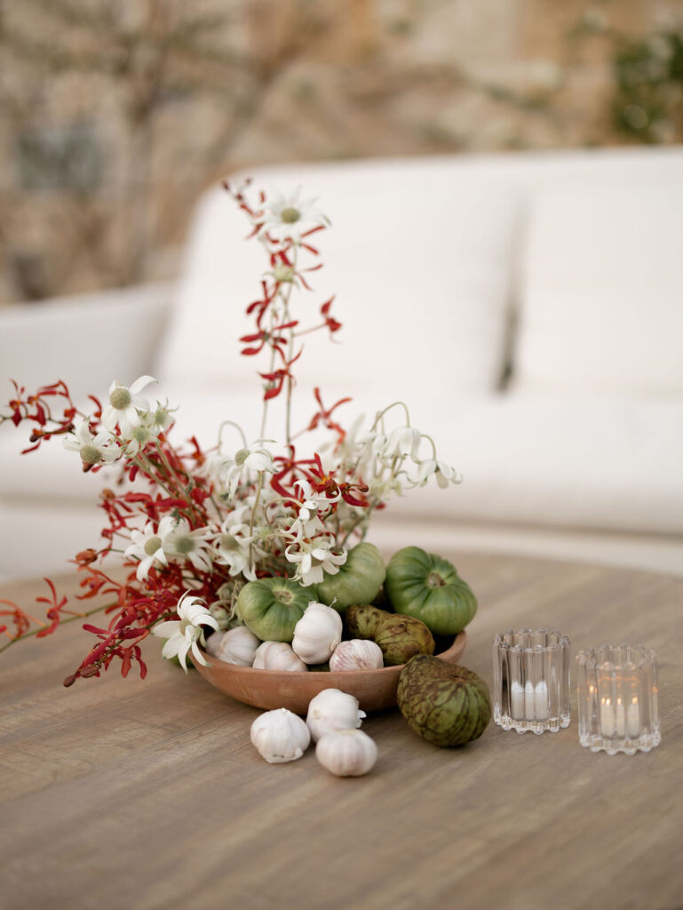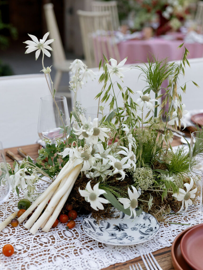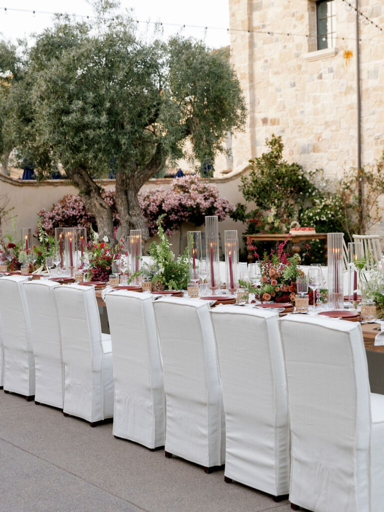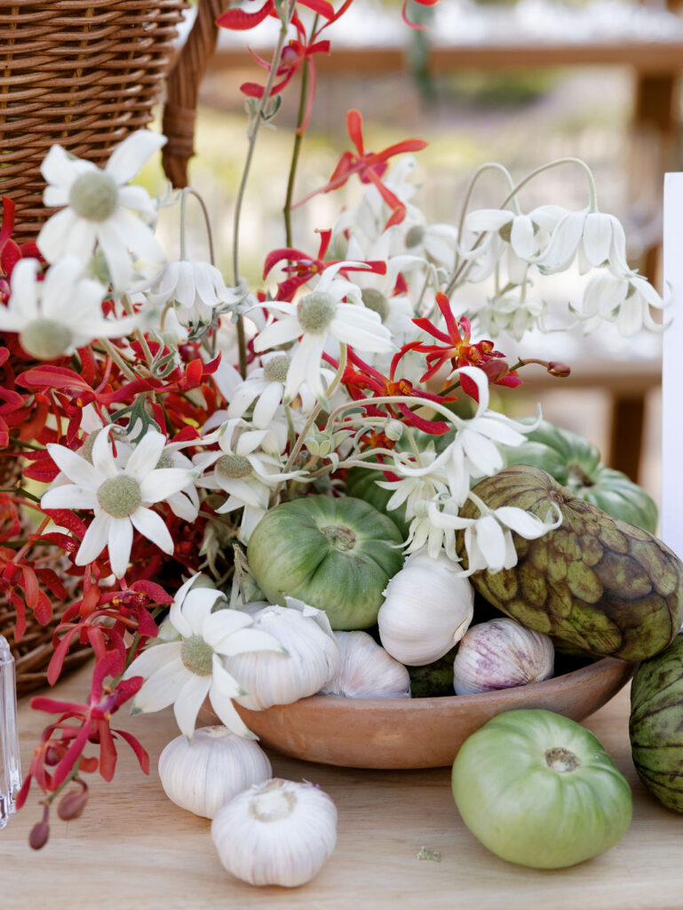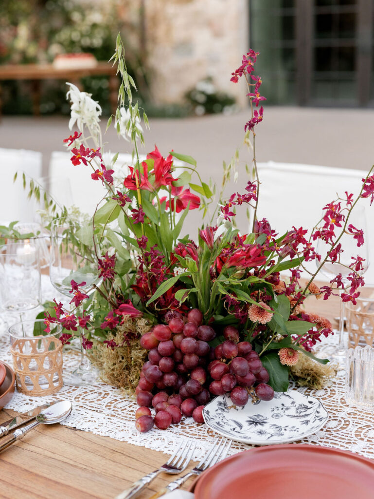 We wanted the tablescape to feel abundant and effortless, as if freshly gathered from a local Italian market. Artichokes, garlic bulbs, heirloom tomatoes, grapes, and even white asparagus were styled into the arrangements, adding a tactile richness that paired beautifully with lush florals in shades of deep red, rust, plum, and soft white. These living, breathing elements created a dynamic rhythm across the table- rustic, romantic, and intentional.