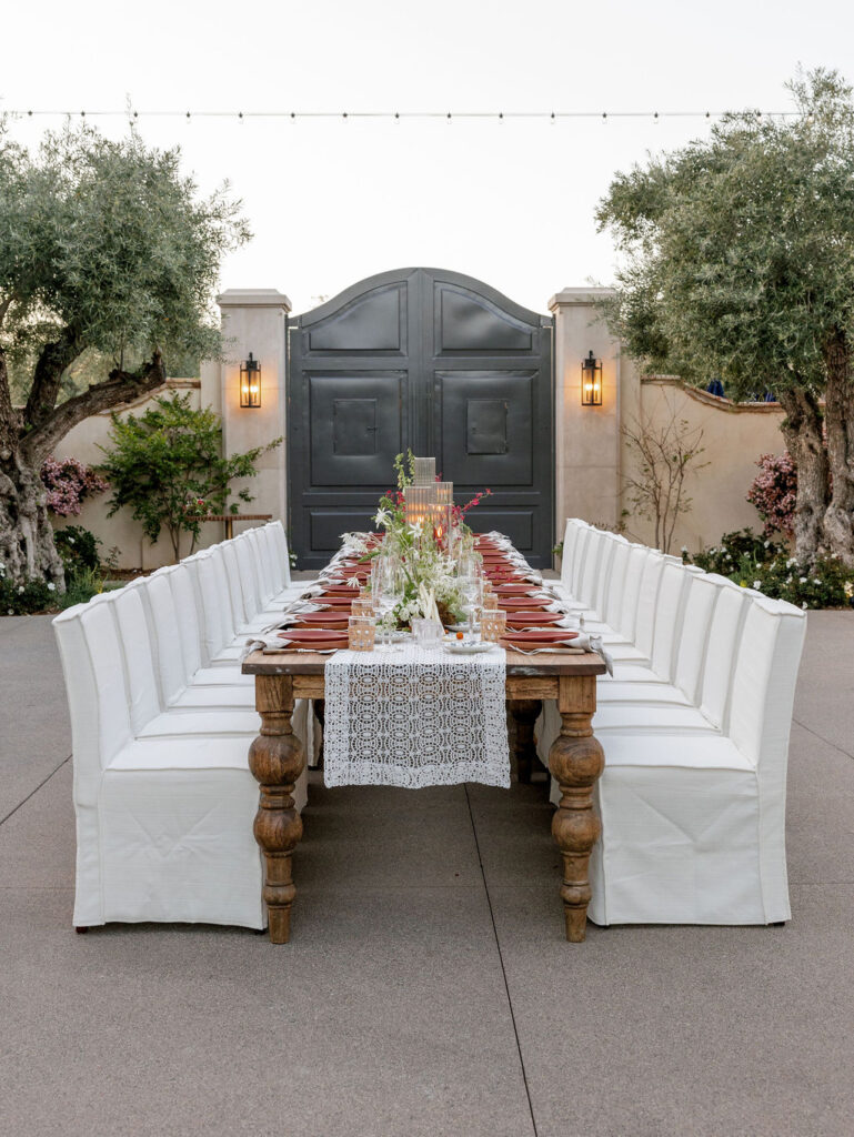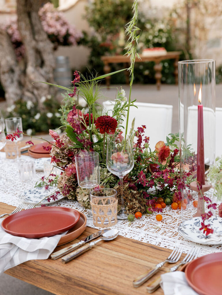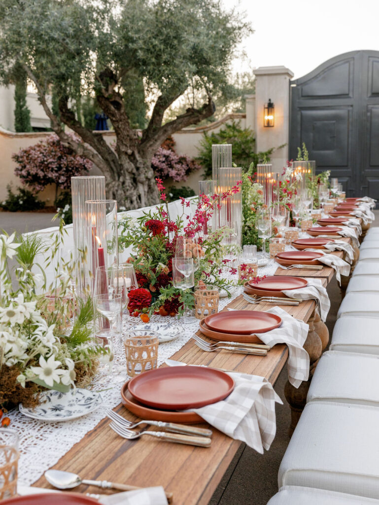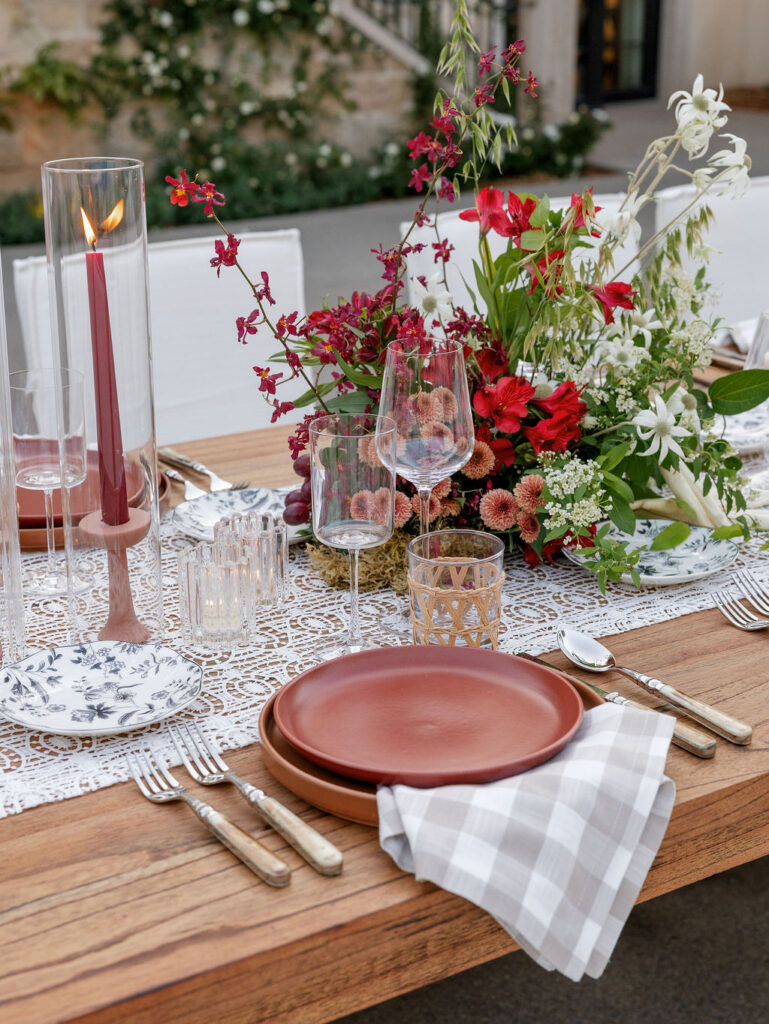 Crocheted runners, stoneware plates, warm terracotta chargers, and checked napkins added layers of pattern without overwhelming the overall aesthetic. It felt grounded and artisanal, echoing the heart of Italian hospitality: beautifully curated but never fussy.